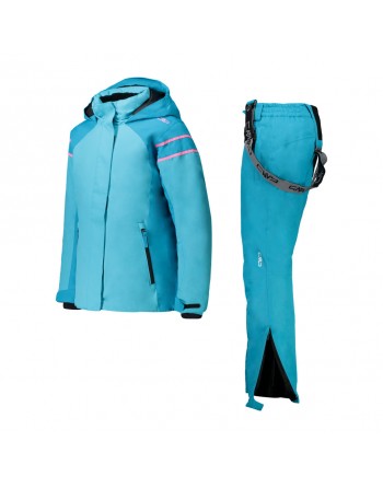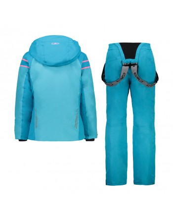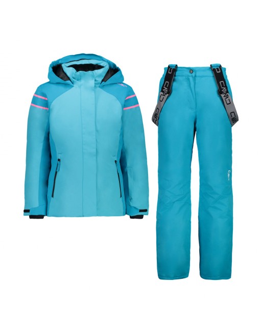 Completo neve per bambina composto da giacca con cappuccio staccabile più pantaloni con bretelle.