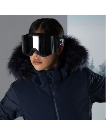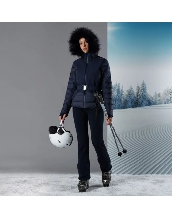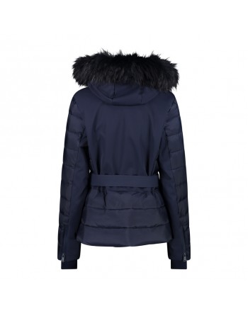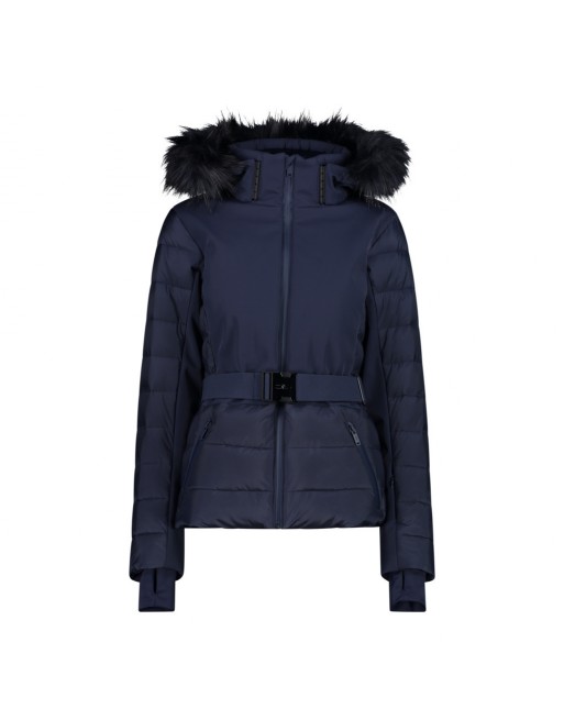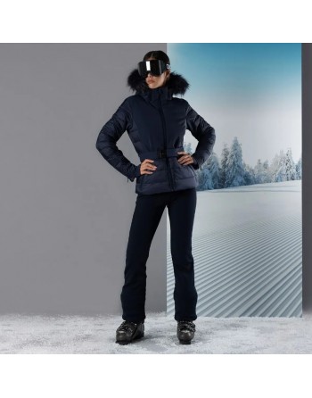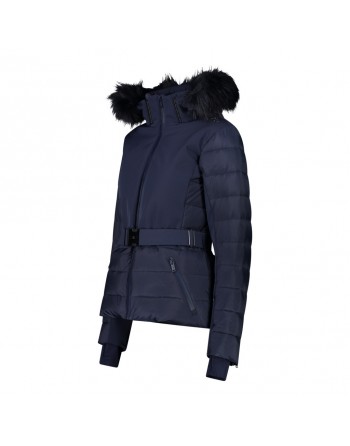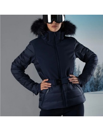 Cappuccio staccabile con pelliccia sintetica, zip frontale con patta antivento e antisfregamento, fondo regolabile con coulisse, due tasche laterali con zip e skipass pocket sulla manica. Cintura regolabile in vita.