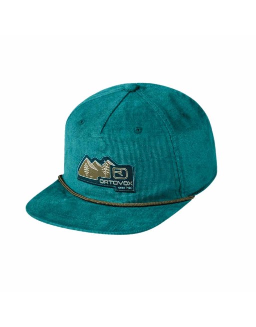 Cappellino con visiera in cotone biologico a costina con cordino in canapa: logo Ortovox con grafica montagne, fodera interna in finissima lana merino.