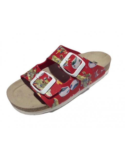 Ciabattine regolabili con due fibbiette in similpelle stampa fantasia. Sottopiede anatomico in gomma-sugheroricoperto in pelle, suola in microporosa.
