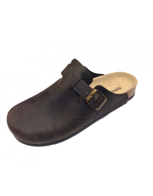 Sabot in pelle naturale ingrassata regolabile con fibbia, sottopiede in gomma-sughero ricoperto in pelle, suola in microporosa.