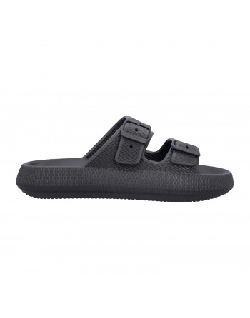 BELEM è la ciabatta monoblocco in EVA, materiale leggero e ammortizzante con due fibbie. Disponibile in taglie doppie, segue la tendenza delle ciabatte mare/piscina strutturate con suola platform.