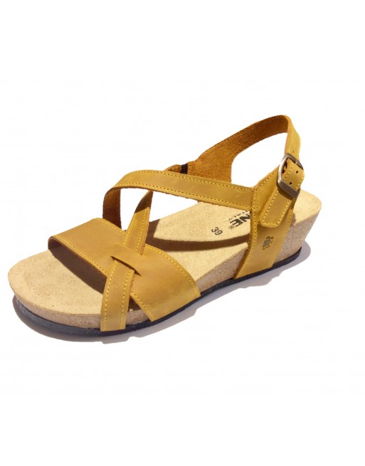 Sandalo con zeppa, con tomaia in pelle nabuk ingrassato e cinturino regolabile con fibbia. Sottopiede a zeppa mescola gomma-sughero-poliuretano 40mm ricoperto in pelle e fondo 6mm in materiale termoplastico misto sughero.