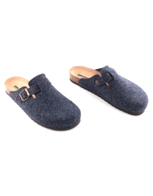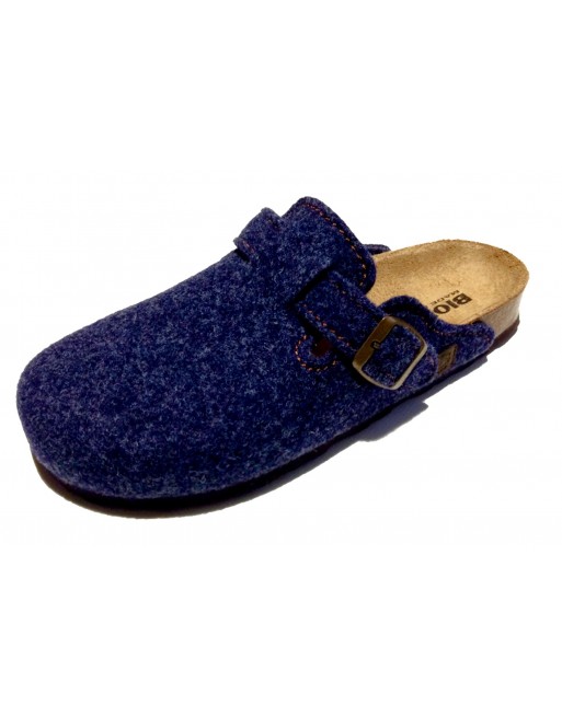 Sabot 100% MADE IN ITALY, in feltro naturale di lana, regolazione cinturino e fibbia, sottopiede in gomma-sughero ricoperto in pelle, suola in microporosa.
