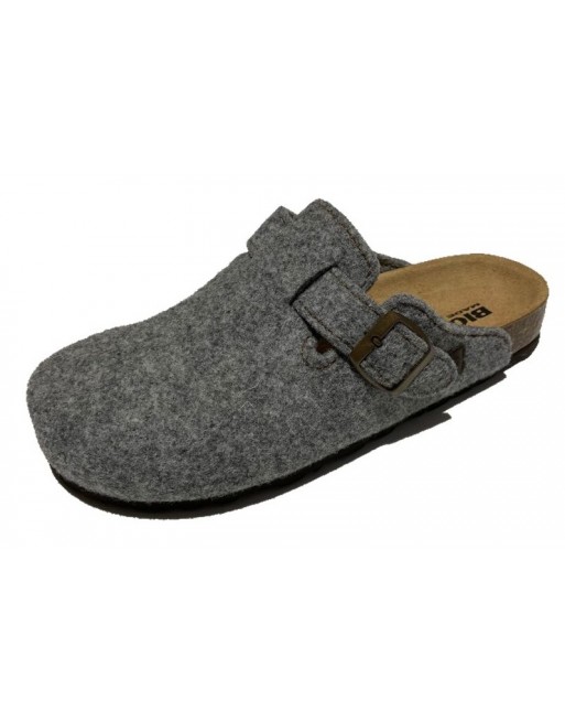 Sabot 100% MADE IN ITALY, in feltro naturale di lana, regolazione cinturino e fibbia, sottopiede in gomma-sughero ricoperto in pelle, suola in microporosa.