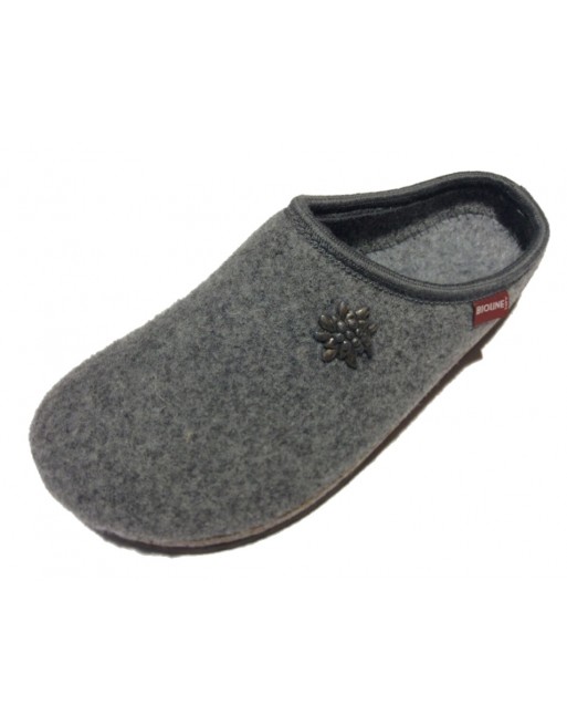Sabot in feltro naturale di lana Merinos con riporto edelweiss, forma particolarmente pregiata di lana, tosata dalle pecore di razza Merino caratterizzata da finezza, morbidezza e qualità uniche (100% da lana non riciclata derivata da tosatura di animali vivi).