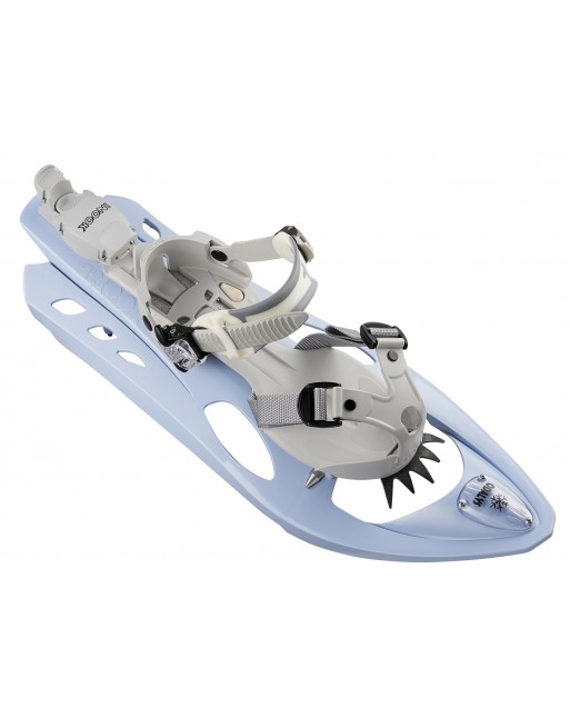 Ciaspola per donna o pesi sotto i kg 80, con ottime caratteristiche tecniche, dal telaio con profilo ad arco sollevato al blocco tallone e relativo alzatacco automatici. Estrema facilità di regolazione misura e chiusura