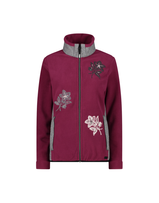 Maglia donna in pile Artctic fleece con zip intera; applicazioni floreali ricamate in stile alpino che le conferiscono un look elegante. Due tasche laterali con zip e orlo elasticizzato.