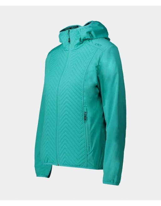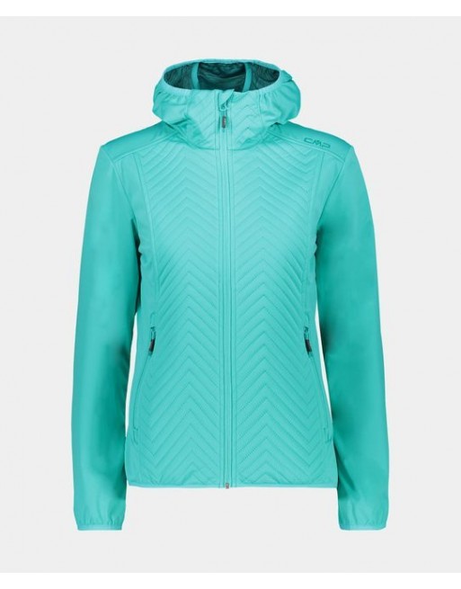 Giacca in softshell da donna con cappuccio fisso, leggerissima imbottitura anteriore in Feel Warm Flat, una fibra sintetica che assicura alte performance anche condizioni di bagnato. Il taglio sfiancato e sportivo incontra la lavorazione trapuntata, che le dona uno stile tipicamente outdoor.