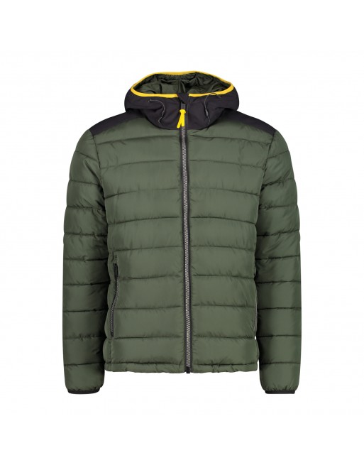 Giacca invernale uomo con imbottitura termica dal look sportivo: inserti in tessuto rinforzato polypongee, cappuccio fisso, interno in contrasto di colore, polsini con orlo elasticizzato