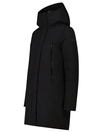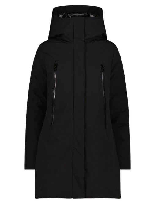 Cappotto da donna con cappuccio con imbottitura Feel Warm Flock, composta da fibra sintetica a fiocchi che garantisce elevato isolamento termico e traspirabilità. Struttura a fiocchi rende il capo leggero, morbido e compatto. Membrana Clima Protect con indice MVP e cuciture completamente nastrate, per un’eccellente protezione contro vento e pioggia.
