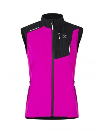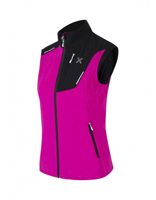 Gilet donna in tessuto nylon DWR 4 way-stretch, parzialmente foderato in rete, centro davanti con zip, tasche mani con zip, tasca petto con zip; tasca dietro con zip, tasche interne aperte.