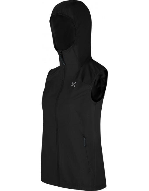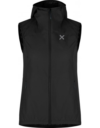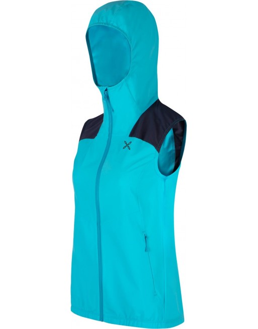 Gilet donna leggero con cappuccio, antivento e idrorepellente; tessuto elasticizzato in 4 direzioni per assecondare tutti i movimenti, con protezione dai raggi solari UPF 50+.