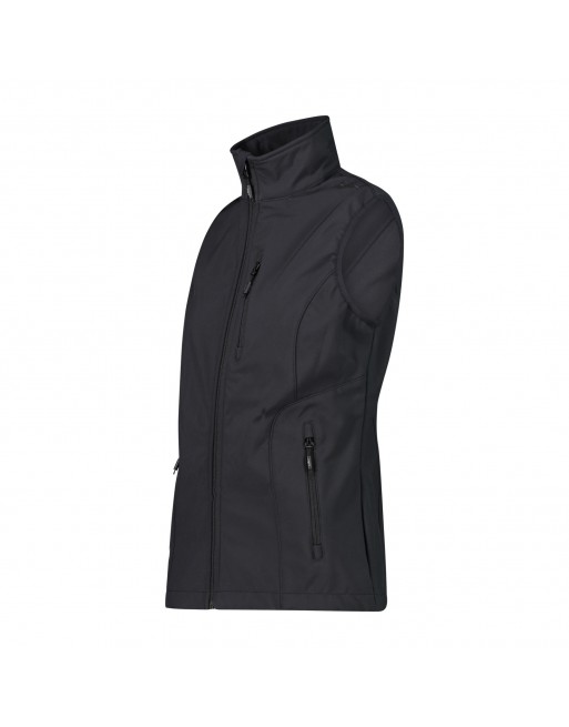 Gilet donna in softshell antivento, impermeabile (Waterproof 7.000) e traspirante (MVP 1.000). All'interno uno strato in pile che migliora l'isolamento e lo rende piacevole a contatto con la pelle. Tre le tasche presenti, due sui lati e una all'altezza del petto, tutte dotate di chiusura zip.
