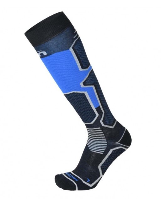 Calza da sci in lana + poliammide + fibra lycra; rinforzi anatomici differenziati su piede destro e sinistro, fasce elastiche alla caviglia e nell'arco plantare, inserti di protezione frontali (zona tibia)