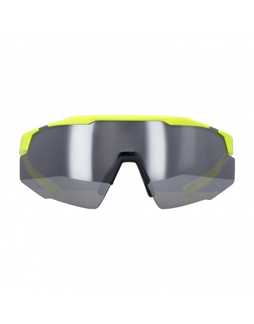 Occchiale multisport dal look avvolgente, con naselli e terminali in morbido TPR; le linee accattivanti gli attribuiscono un'attituidine sportiva, la cerniera integrata alla montatura rendere la struttura particolarmente solida e resistente.