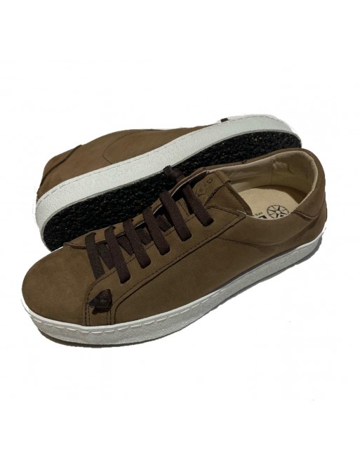 Sneakers con lacci elastici annodati e tomaia in pelle ingrassata e bottalata. Fodera in pelle capretta, sottopiede estraibile e suola riciclata a zeppa con striscia in gomma bianca naturale.